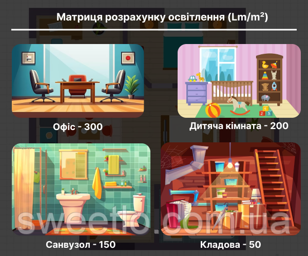 Нижче можна побачити, скільки потрібно світла для різних потреб. Просто множити кількість квадратних метрів на цифру, зазначену в матриці:
